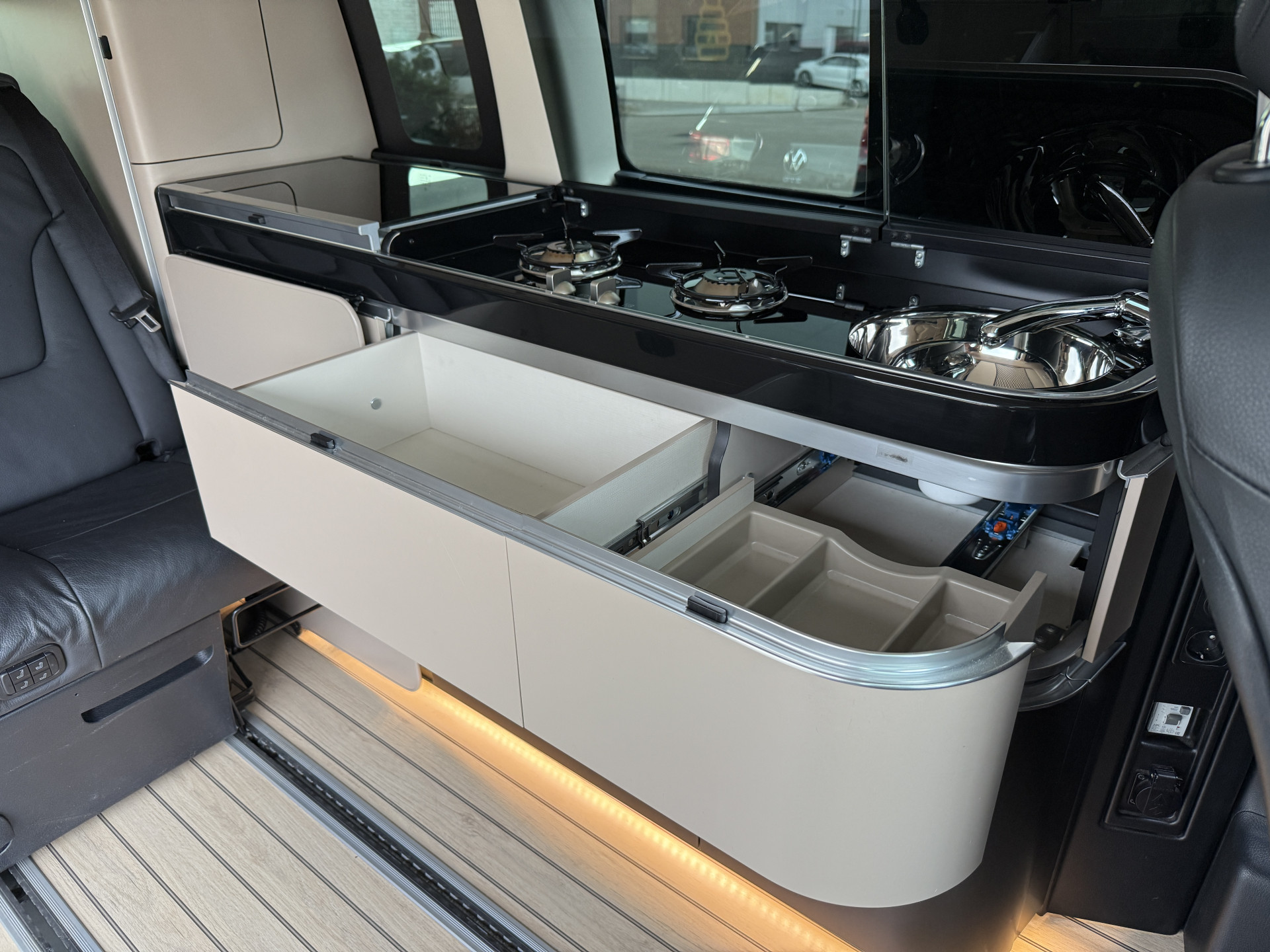 - Hout afgewerkte vloer in het campergedeelte