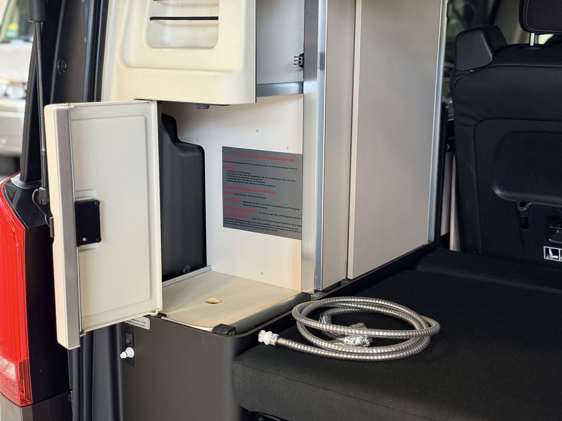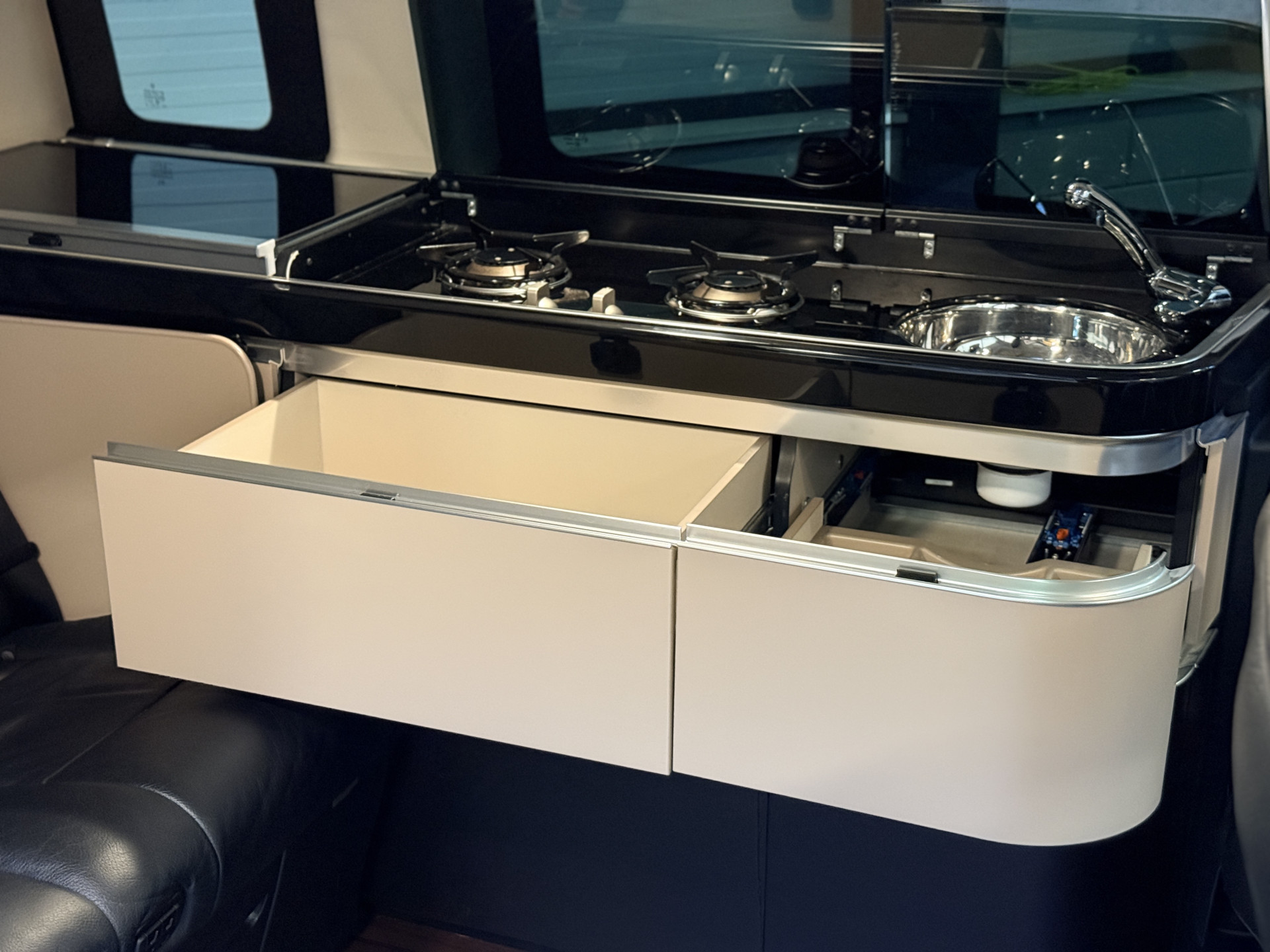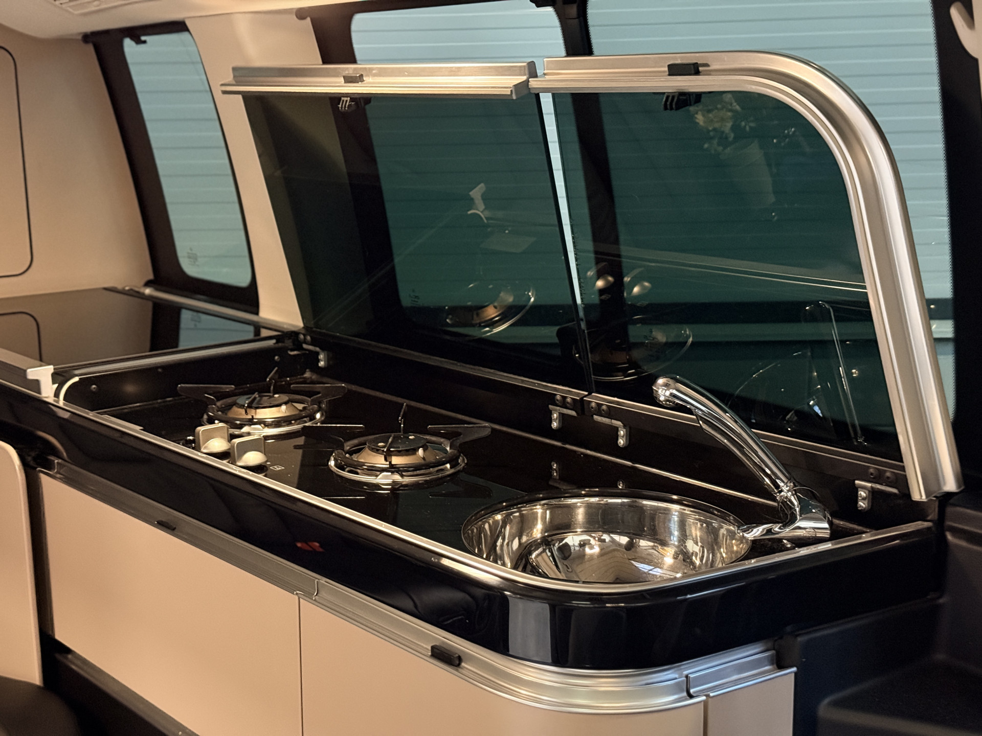 - Hout afgewerkte vloer in het campergedeelte